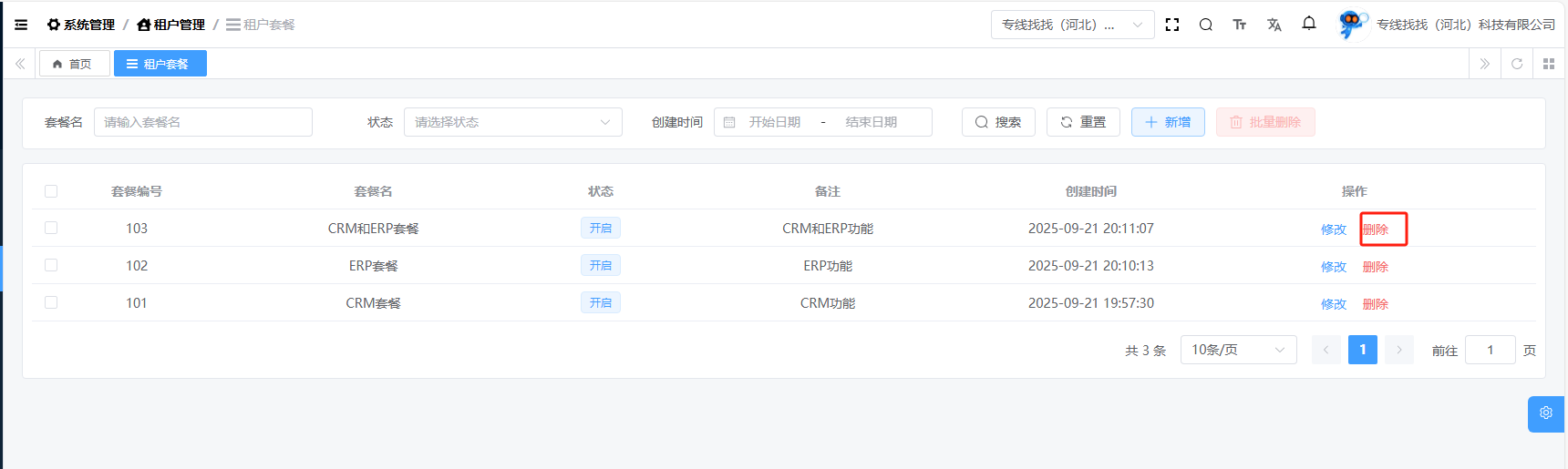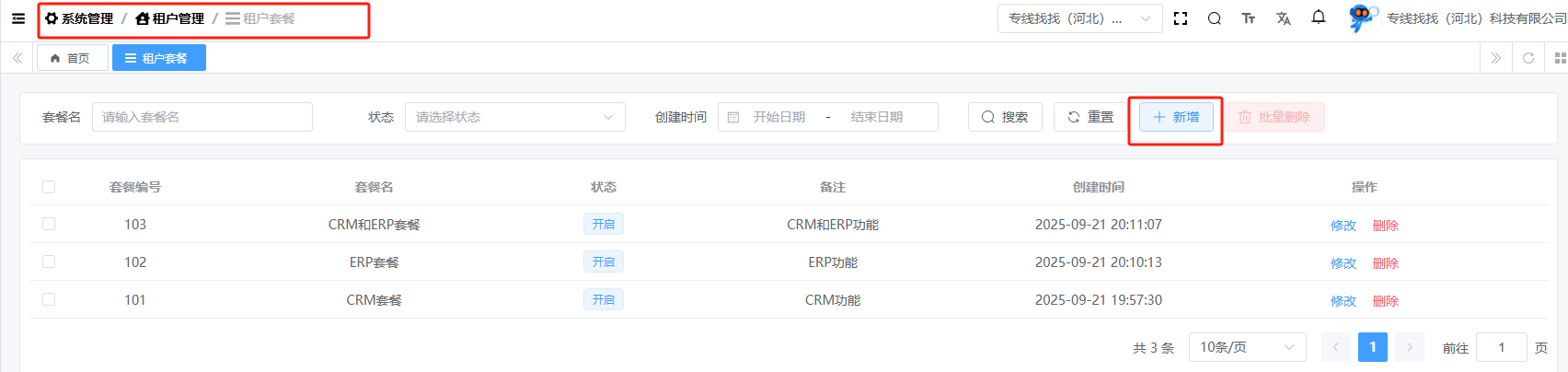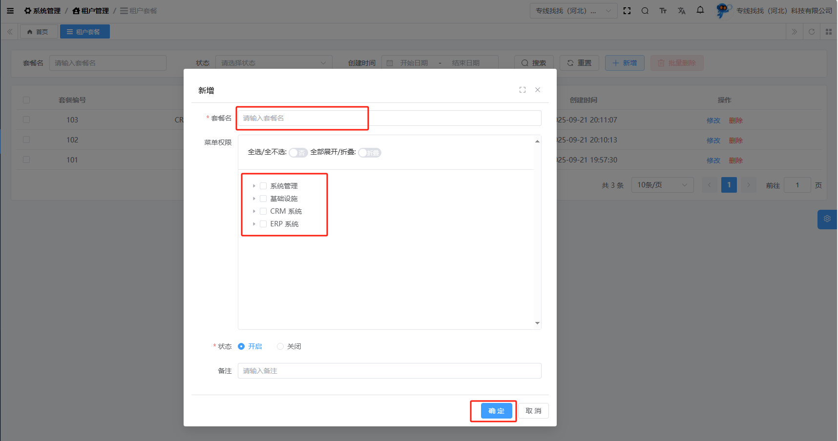 目录 搜索 展开 基础设施文件管理文件配置文件列表系统管理租户管理租户套餐租户列表 暂无相关搜索结果! 阅读次数:19 租户套餐 1.1添加租户套餐添加租户套餐,输入套餐名,选择菜单权限,最后点击确定即可。1.2删除租户套餐作者:admin 创建时间:2025-10-10 11:00最后编辑:admin 更新时间:2025-10-10 11:18