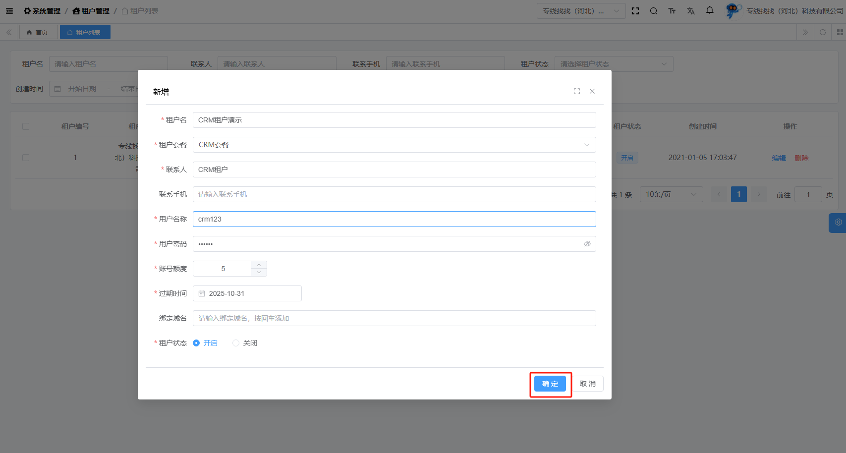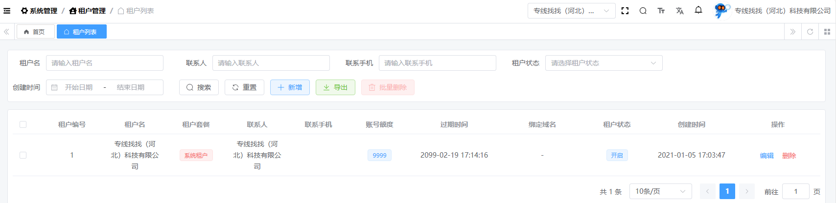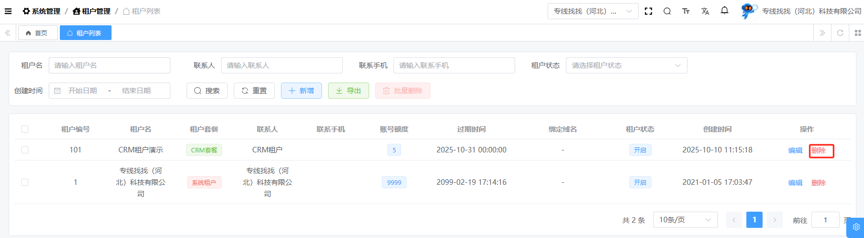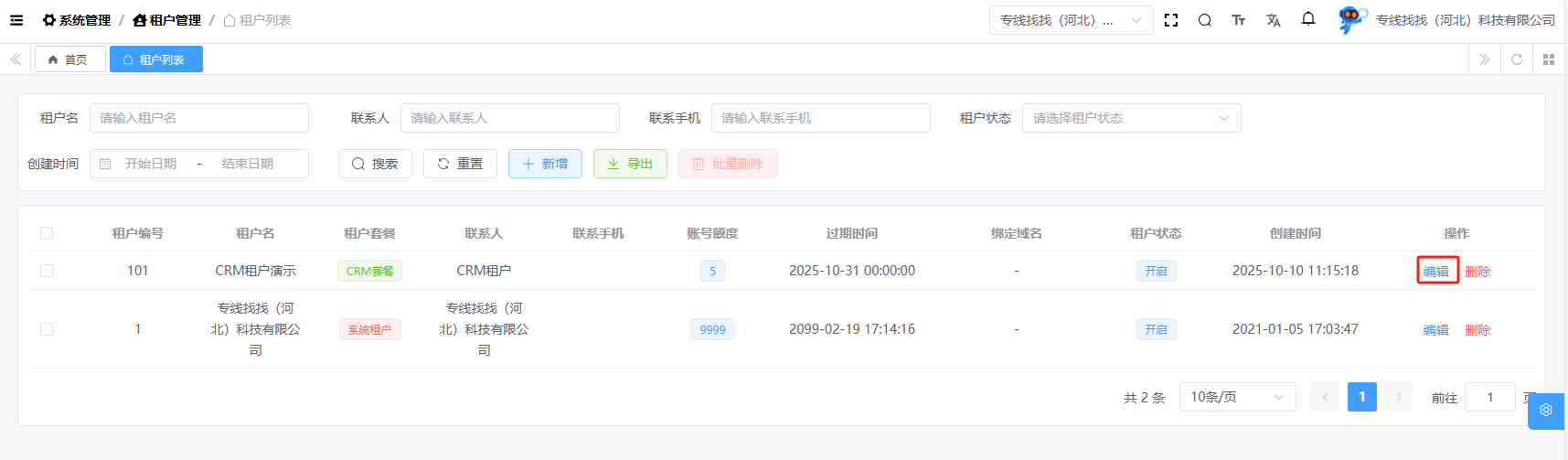 目录 搜索 展开 基础设施文件管理文件配置文件列表系统管理租户管理租户套餐租户列表 暂无相关搜索结果! 阅读次数:27 租户列表 租户列表中可以查看所有租户信息,进行添加修改和删除租户功能。1.1添加租户账号额度:是租户最多可以建立多少账号过期时间:是租户使用到什么时间1.2编辑租户1.3删除租户作者:admin 创建时间:2025-10-10 11:01最后编辑:admin 更新时间:2025-10-10 11:18