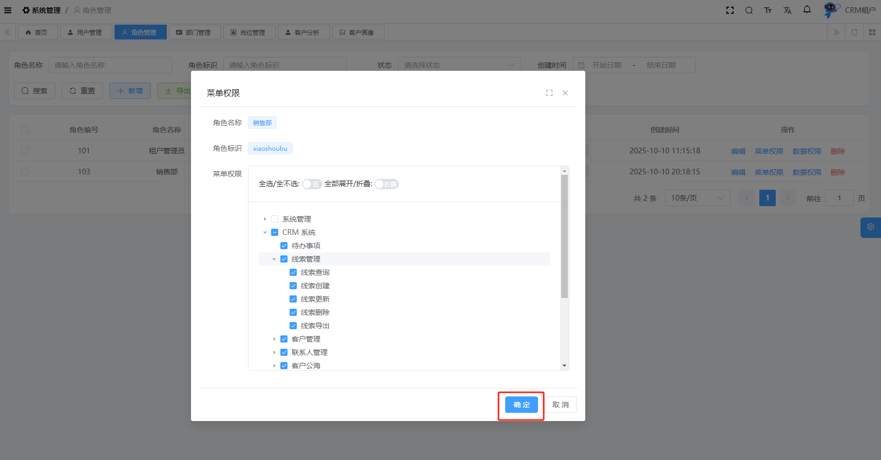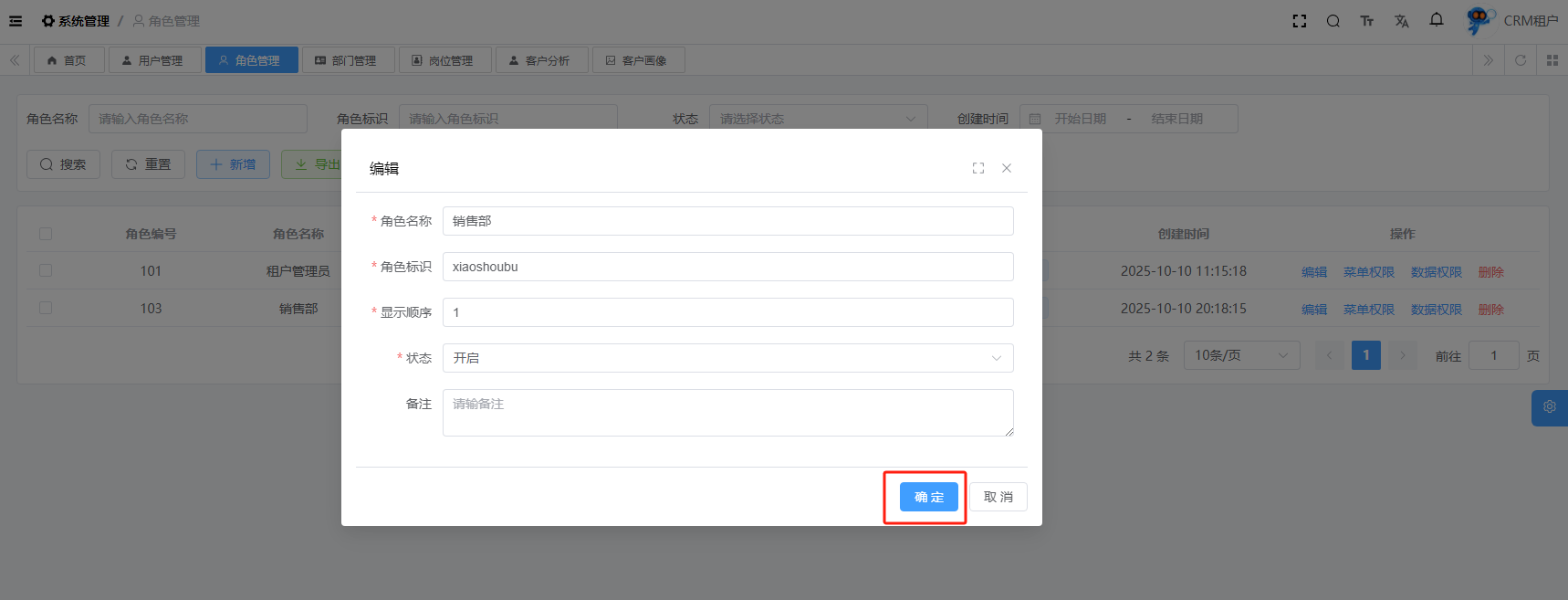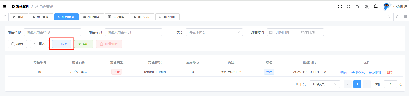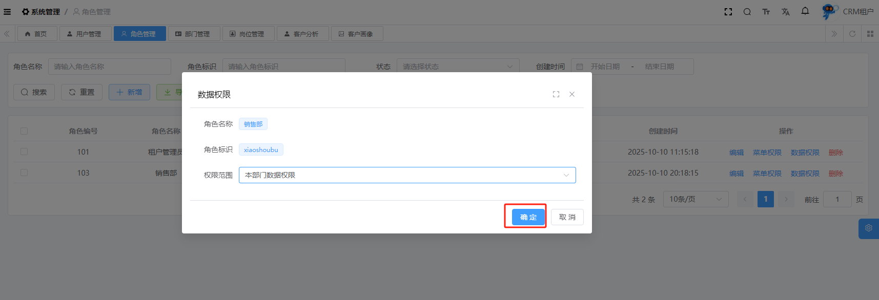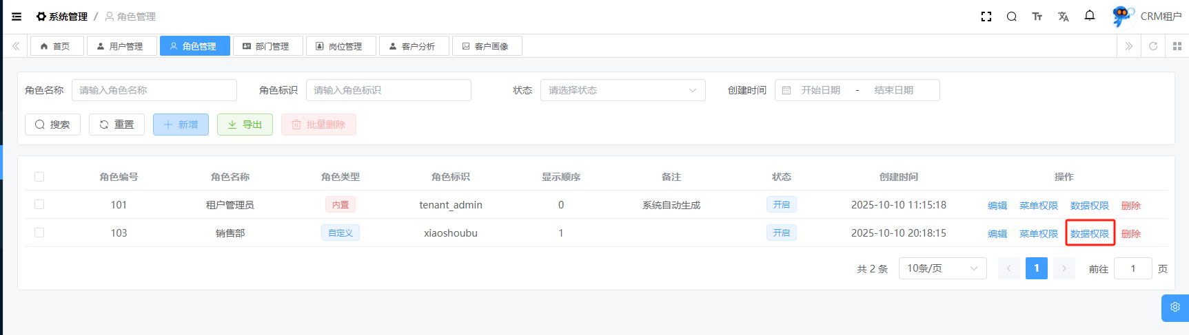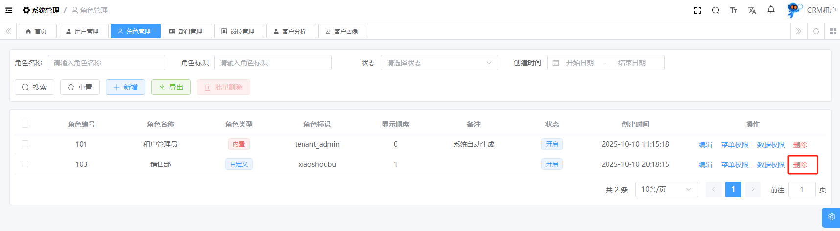 目录 搜索 展开 系统设置用户管理角色管理部门管理岗位管理消息中心短信管理短信日志邮箱管理邮件记录站内信管理消息记录通知公告工作流程流程管理流程模型流程分类审批中心我的流程待办任务已办任务抄送我的CRM系统待办事项线索管理客户管理联系人管理客户公海商机管理合同管理回款管理回款计划产品管理数据统计客户分析排行榜员工业绩客户画像销售漏斗系统配置客户公海配置客户限制配置产品分类配置商机状态配置合同配置ERP系统采购管理采购订单采购入库采购退货供应商信息销售管理销售订单销售出库销售退货客户信息库存管理仓库信息产品库存出入库明细其它入库其它出库库存调拨库存盘点产品管理产品信息产品分类产品单位财务管理付款单收款单结算账户 暂无相关搜索结果! 阅读次数:22 角色管理 1.1角色添加1.2角色编辑1.3角色菜单权限分配1.4角色数据权限分配1.5角色删除作者:admin 创建时间:2025-10-10 17:36最后编辑:admin 更新时间:2025-10-14 11:08