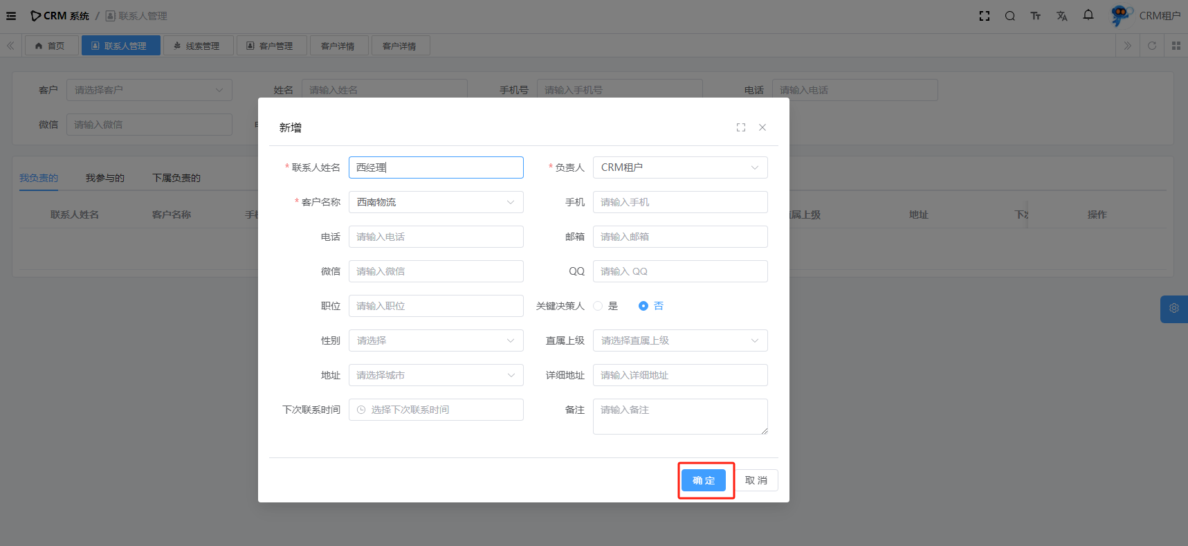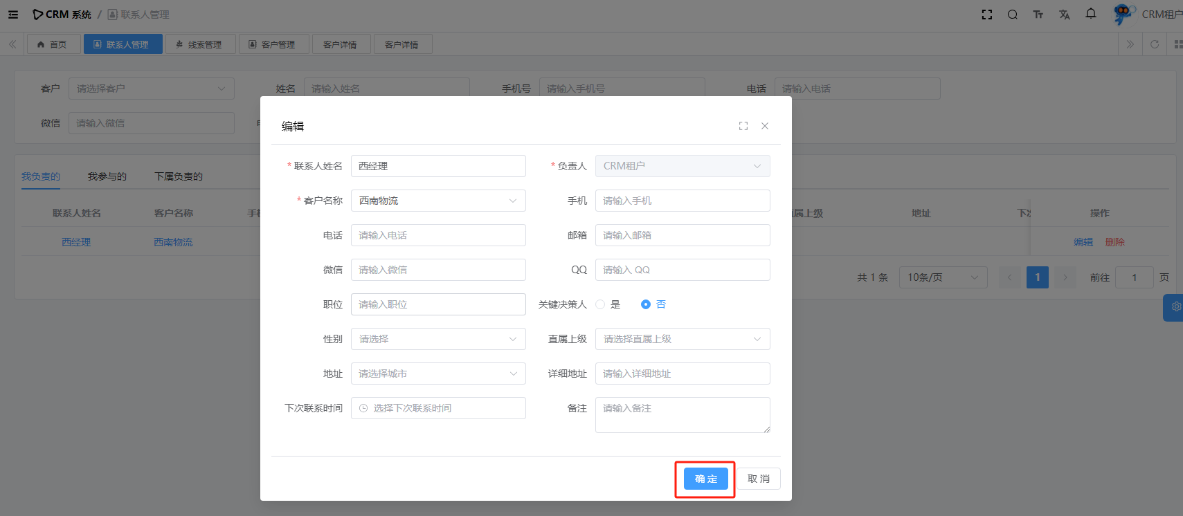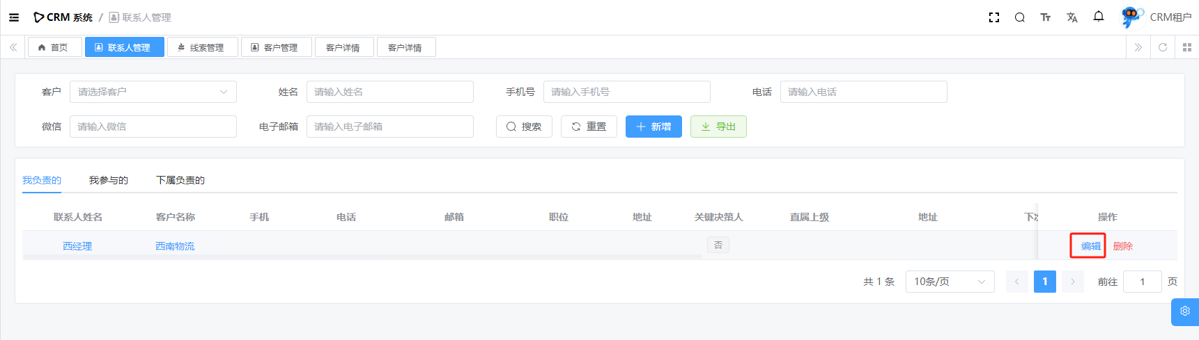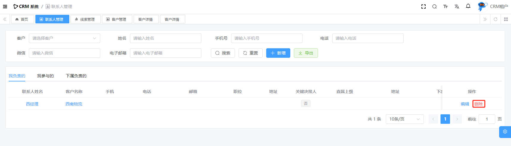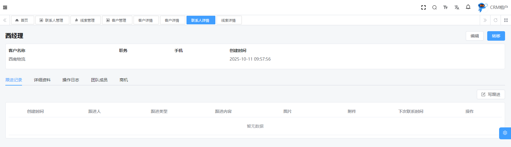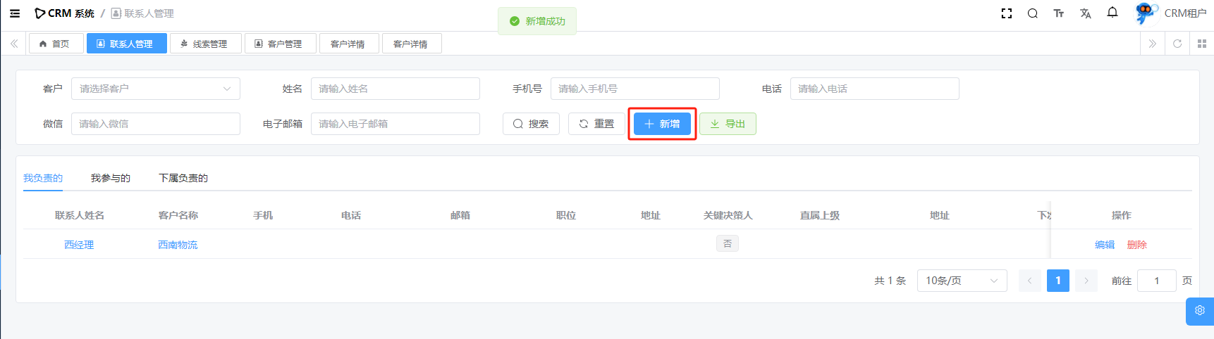 目录 搜索 展开 系统设置用户管理角色管理部门管理岗位管理消息中心短信管理短信日志邮箱管理邮件记录站内信管理消息记录通知公告工作流程流程管理流程模型流程分类审批中心我的流程待办任务已办任务抄送我的CRM系统待办事项线索管理客户管理联系人管理客户公海商机管理合同管理回款管理回款计划产品管理数据统计客户分析排行榜员工业绩客户画像销售漏斗系统配置客户公海配置客户限制配置产品分类配置商机状态配置合同配置ERP系统采购管理采购订单采购入库采购退货供应商信息销售管理销售订单销售出库销售退货客户信息库存管理仓库信息产品库存出入库明细其它入库其它出库库存调拨库存盘点产品管理产品信息产品分类产品单位财务管理付款单收款单结算账户 暂无相关搜索结果! 阅读次数:17 联系人管理 1.1新增1.2详情【商机】参考【商机管理】1.3编辑1.4删除作者:admin 创建时间:2025-10-10 17:38最后编辑:admin 更新时间:2025-10-14 11:08