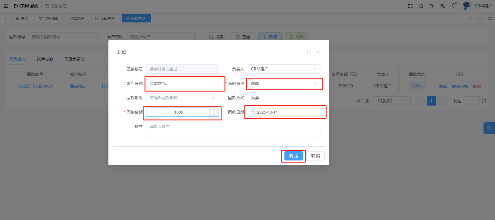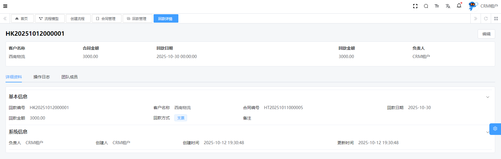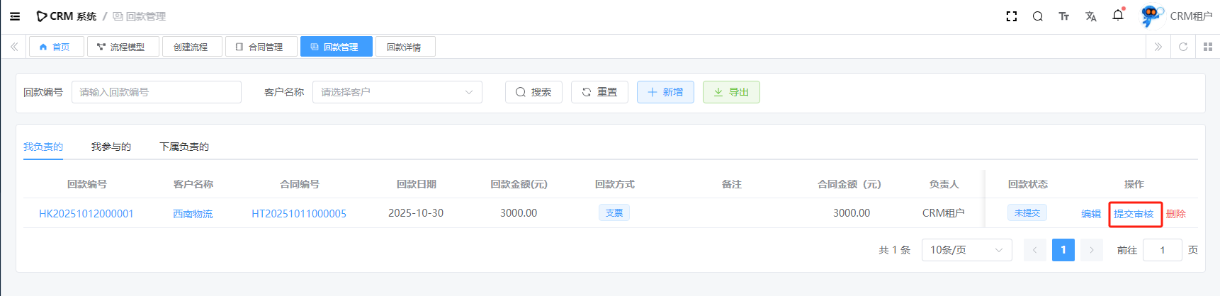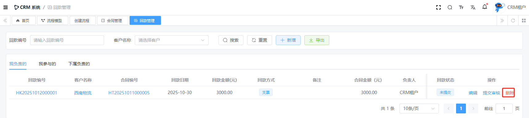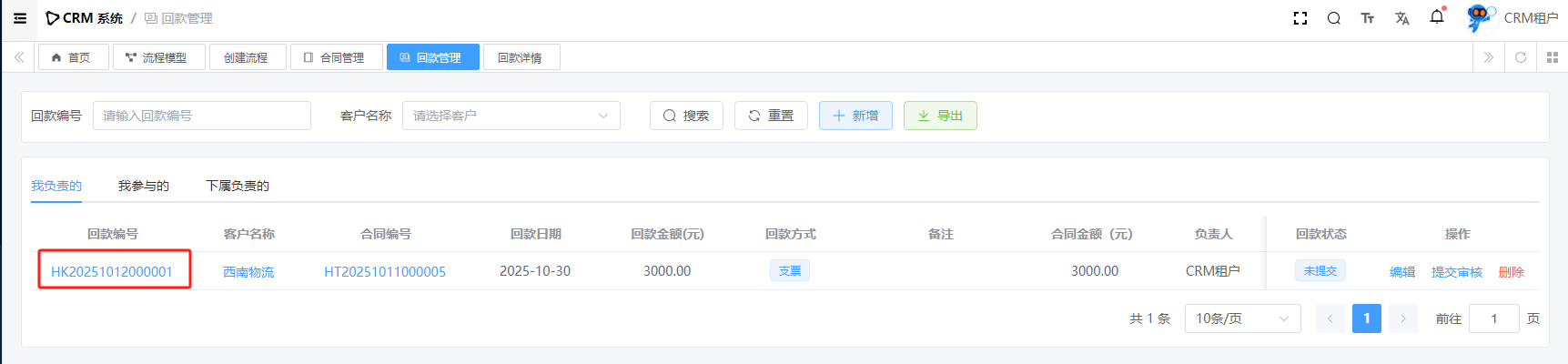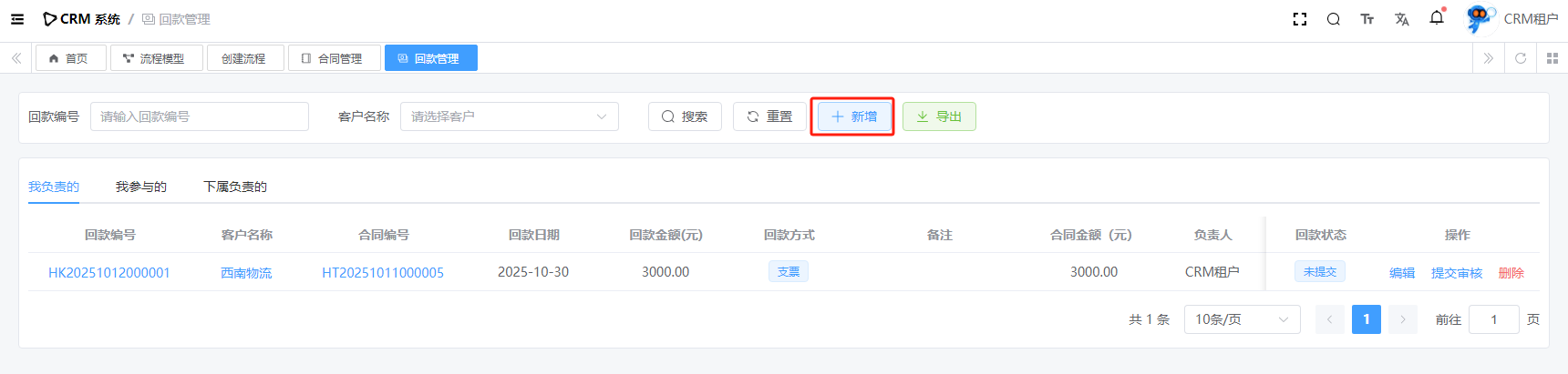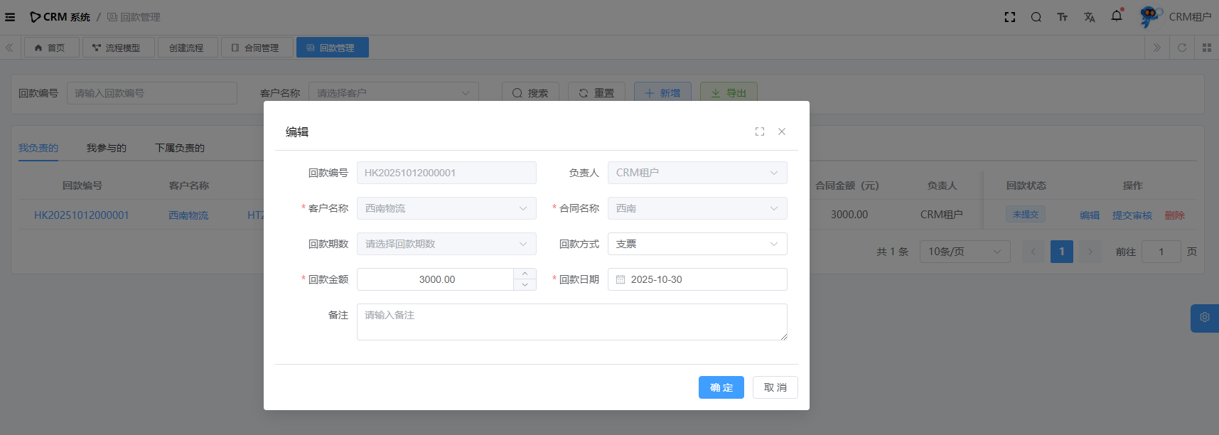 目录 搜索 展开 系统设置用户管理角色管理部门管理岗位管理消息中心短信管理短信日志邮箱管理邮件记录站内信管理消息记录通知公告工作流程流程管理流程模型流程分类审批中心我的流程待办任务已办任务抄送我的CRM系统待办事项线索管理客户管理联系人管理客户公海商机管理合同管理回款管理回款计划产品管理数据统计客户分析排行榜员工业绩客户画像销售漏斗系统配置客户公海配置客户限制配置产品分类配置商机状态配置合同配置ERP系统采购管理采购订单采购入库采购退货供应商信息销售管理销售订单销售出库销售退货客户信息库存管理仓库信息产品库存出入库明细其它入库其它出库库存调拨库存盘点产品管理产品信息产品分类产品单位财务管理付款单收款单结算账户 暂无相关搜索结果! 阅读次数:16 回款管理 CRM 回款,主要指的是在销售过程中,企业与客户签订销售【合同】后,从客户那里实际收到的款项的记录。目前有两种回款链路,因此表关系如下图所示:【合同】=>【回款】【合同】=>【回款计划】=>【回款】1.1新增1.2详情1.3提交审核1.3.1查看审核进度1.4编辑1.5删除作者:admin 创建时间:2025-10-10 17:39最后编辑:admin 更新时间:2025-10-14 11:08
