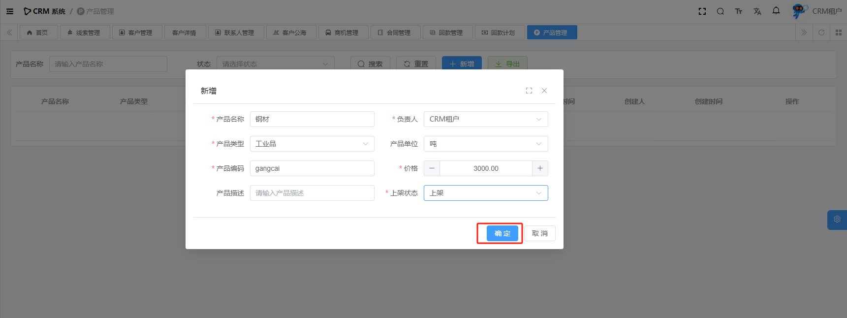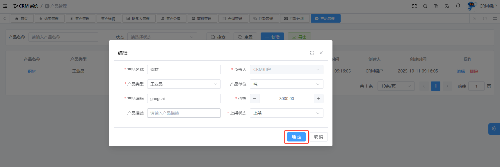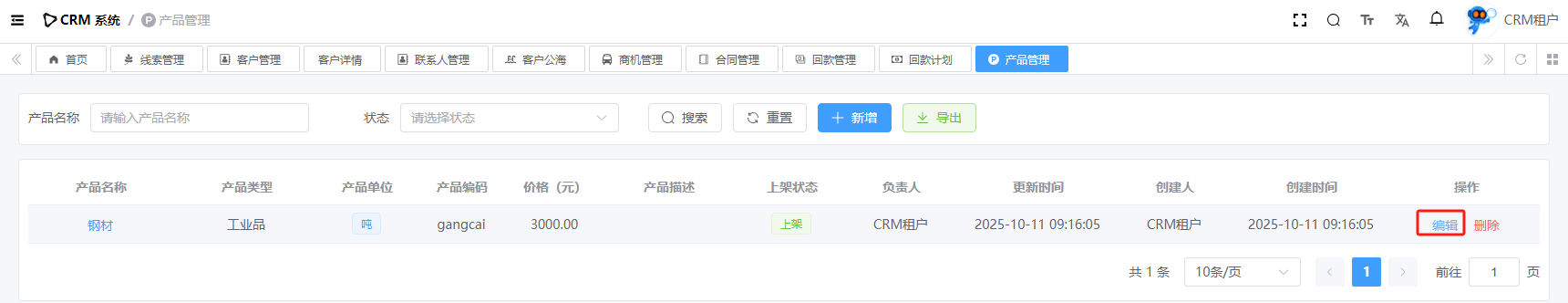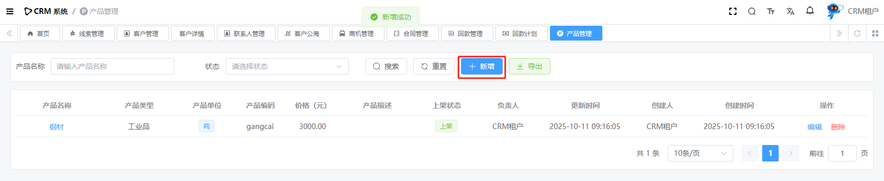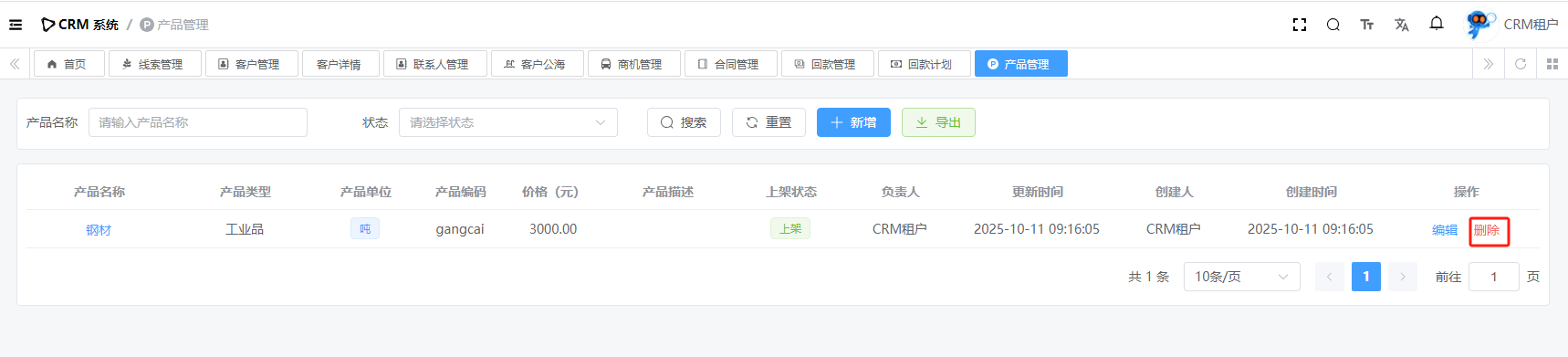 目录 搜索 展开 系统设置用户管理角色管理部门管理岗位管理消息中心短信管理短信日志邮箱管理邮件记录站内信管理消息记录通知公告工作流程流程管理流程模型流程分类审批中心我的流程待办任务已办任务抄送我的CRM系统待办事项线索管理客户管理联系人管理客户公海商机管理合同管理回款管理回款计划产品管理数据统计客户分析排行榜员工业绩客户画像销售漏斗系统配置客户公海配置客户限制配置产品分类配置商机状态配置合同配置ERP系统采购管理采购订单采购入库采购退货供应商信息销售管理销售订单销售出库销售退货客户信息库存管理仓库信息产品库存出入库明细其它入库其它出库库存调拨库存盘点产品管理产品信息产品分类产品单位财务管理付款单收款单结算账户 暂无相关搜索结果! 阅读次数:12 产品管理 1.1新增1.2编辑1.3删除作者:admin 创建时间:2025-10-10 17:40最后编辑:admin 更新时间:2025-10-14 11:08