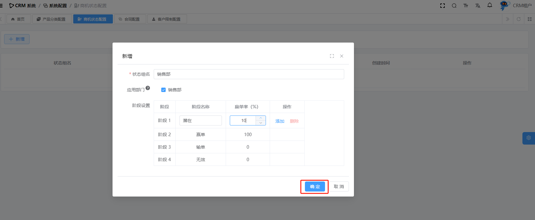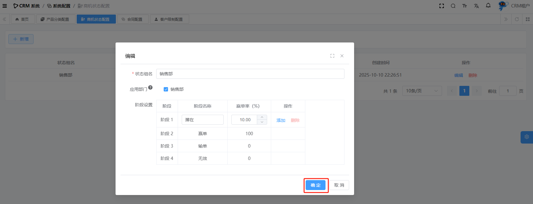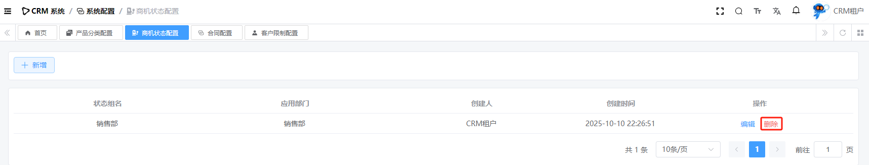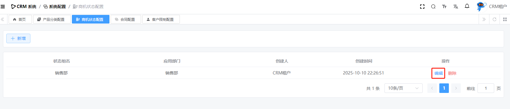 目录 搜索 展开 系统设置用户管理角色管理部门管理岗位管理消息中心短信管理短信日志邮箱管理邮件记录站内信管理消息记录通知公告工作流程流程管理流程模型流程分类审批中心我的流程待办任务已办任务抄送我的CRM系统待办事项线索管理客户管理联系人管理客户公海商机管理合同管理回款管理回款计划产品管理数据统计客户分析排行榜员工业绩客户画像销售漏斗系统配置客户公海配置客户限制配置产品分类配置商机状态配置合同配置ERP系统采购管理采购订单采购入库采购退货供应商信息销售管理销售订单销售出库销售退货客户信息库存管理仓库信息产品库存出入库明细其它入库其它出库库存调拨库存盘点产品管理产品信息产品分类产品单位财务管理付款单收款单结算账户 暂无相关搜索结果! 阅读次数:11 商机状态配置 1.1新增1.2编辑1.3删除作者:admin 创建时间:2025-10-10 17:42最后编辑:admin 更新时间:2025-10-14 11:08