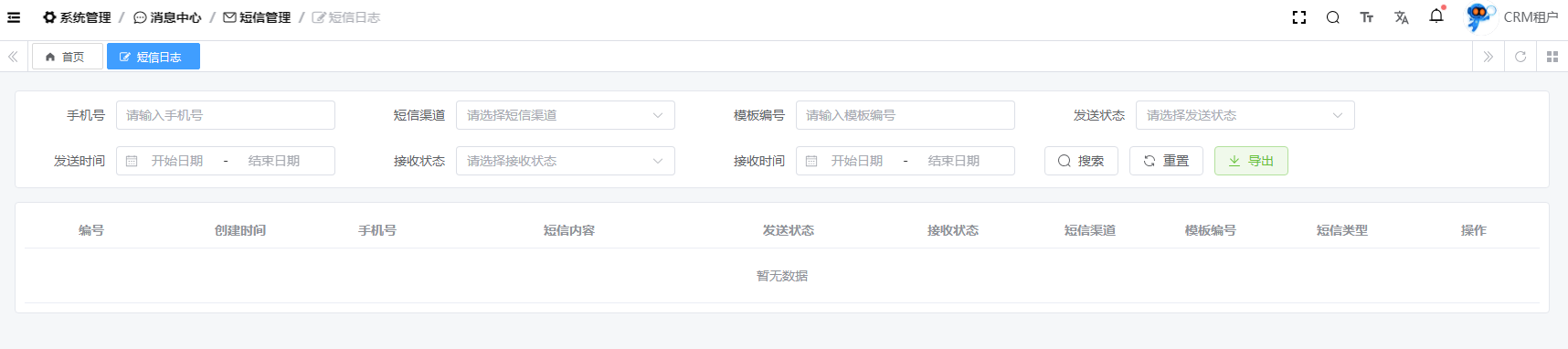目录 搜索 展开 系统设置用户管理角色管理部门管理岗位管理消息中心短信管理短信日志邮箱管理邮件记录站内信管理消息记录通知公告工作流程流程管理流程模型流程分类审批中心我的流程待办任务已办任务抄送我的CRM系统待办事项线索管理客户管理联系人管理客户公海商机管理合同管理回款管理回款计划产品管理数据统计客户分析排行榜员工业绩客户画像销售漏斗系统配置客户公海配置客户限制配置产品分类配置商机状态配置合同配置ERP系统采购管理采购订单采购入库采购退货供应商信息销售管理销售订单销售出库销售退货客户信息库存管理仓库信息产品库存出入库明细其它入库其它出库库存调拨库存盘点产品管理产品信息产品分类产品单位财务管理付款单收款单结算账户 暂无相关搜索结果! 阅读次数:16 短信日志 短信发送记录作者:admin 创建时间:2025-10-12 19:37最后编辑:admin 更新时间:2025-10-14 11:08