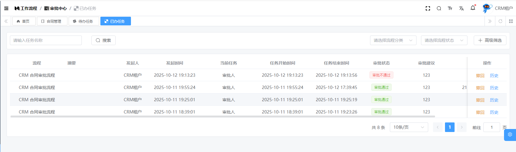 目录 搜索 展开 系统设置用户管理角色管理部门管理岗位管理消息中心短信管理短信日志邮箱管理邮件记录站内信管理消息记录通知公告工作流程流程管理流程模型流程分类审批中心我的流程待办任务已办任务抄送我的CRM系统待办事项线索管理客户管理联系人管理客户公海商机管理合同管理回款管理回款计划产品管理数据统计客户分析排行榜员工业绩客户画像销售漏斗系统配置客户公海配置客户限制配置产品分类配置商机状态配置合同配置ERP系统采购管理采购订单采购入库采购退货供应商信息销售管理销售订单销售出库销售退货客户信息库存管理仓库信息产品库存出入库明细其它入库其它出库库存调拨库存盘点产品管理产品信息产品分类产品单位财务管理付款单收款单结算账户 暂无相关搜索结果! 阅读次数:8 已办任务 已经办理完的任务作者:admin 创建时间:2025-10-12 19:48最后编辑:admin 更新时间:2025-10-14 11:08