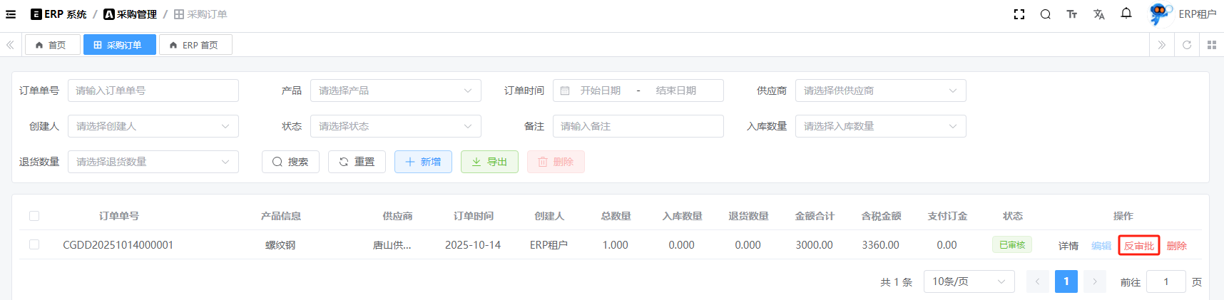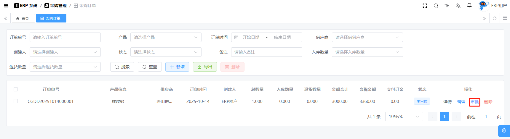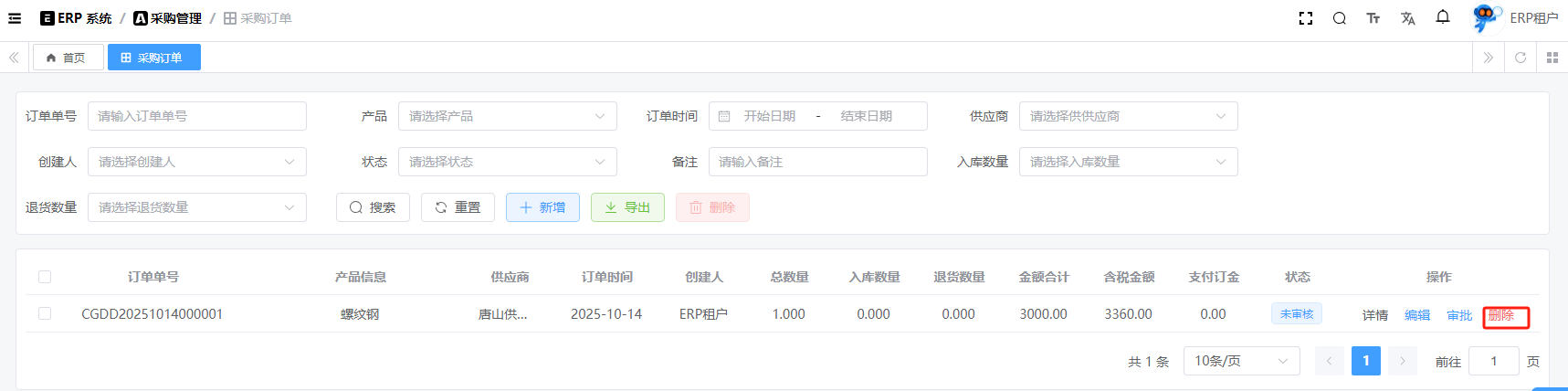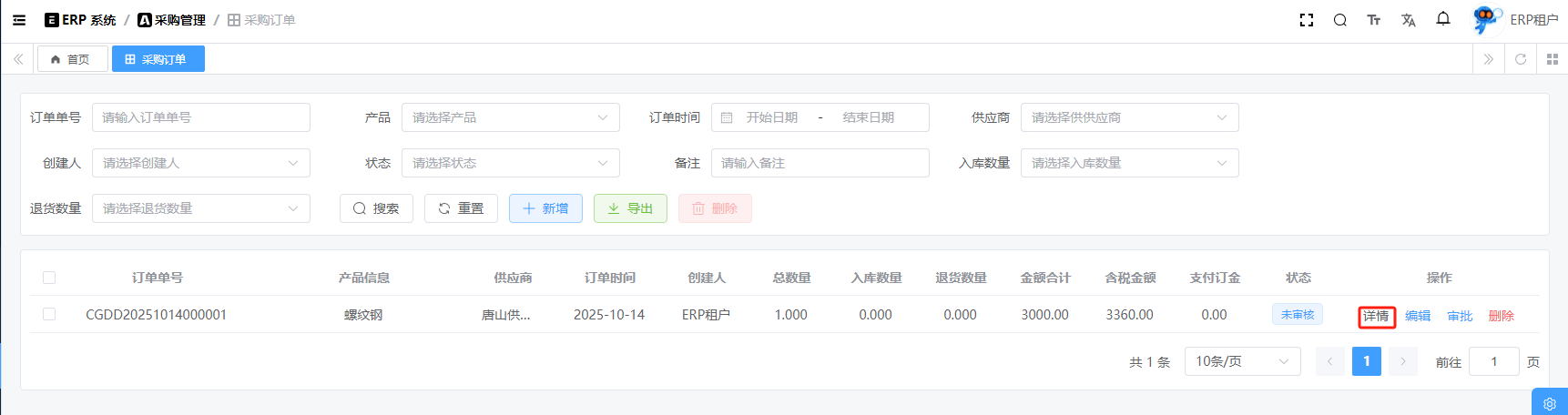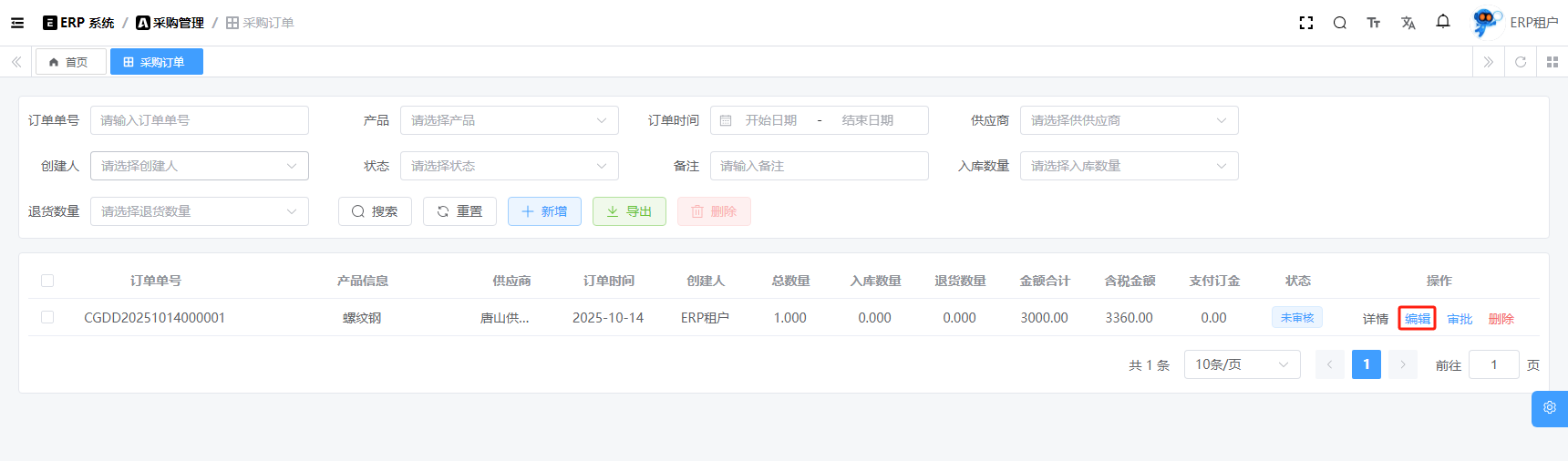 目录 搜索 展开 系统设置用户管理角色管理部门管理岗位管理消息中心短信管理短信日志邮箱管理邮件记录站内信管理消息记录通知公告工作流程流程管理流程模型流程分类审批中心我的流程待办任务已办任务抄送我的CRM系统待办事项线索管理客户管理联系人管理客户公海商机管理合同管理回款管理回款计划产品管理数据统计客户分析排行榜员工业绩客户画像销售漏斗系统配置客户公海配置客户限制配置产品分类配置商机状态配置合同配置ERP系统采购管理采购订单采购入库采购退货供应商信息销售管理销售订单销售出库销售退货客户信息库存管理仓库信息产品库存出入库明细其它入库其它出库库存调拨库存盘点产品管理产品信息产品分类产品单位财务管理付款单收款单结算账户 暂无相关搜索结果! 阅读次数:15 采购订单 采购订单,它不会直接影响库存,只有在入库、退货等操作才会影响库存。1.1新增1.2编辑1.3删除1.4详情1.5审批1.6反审批作者:admin 创建时间:2025-10-13 11:31最后编辑:admin 更新时间:2025-10-14 11:08