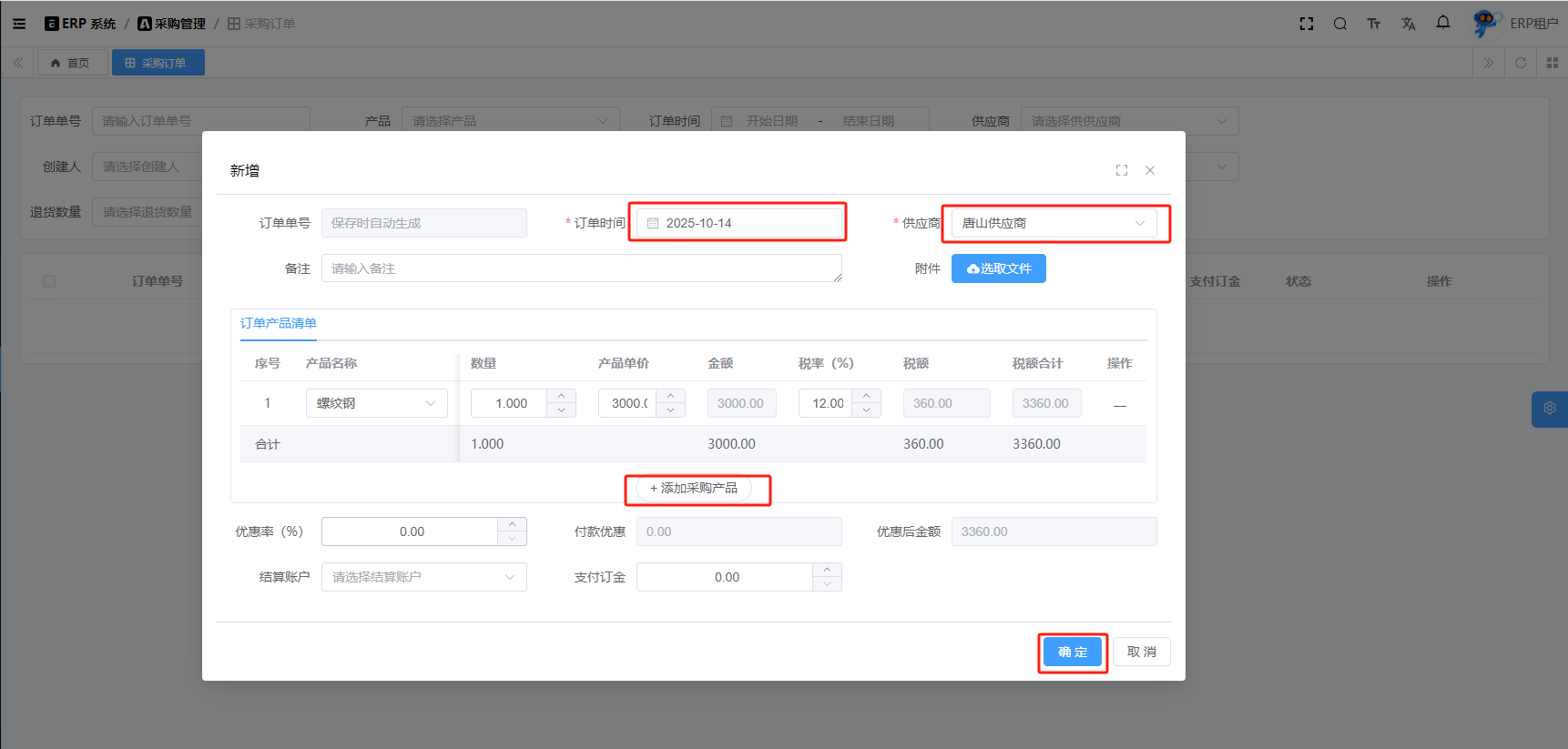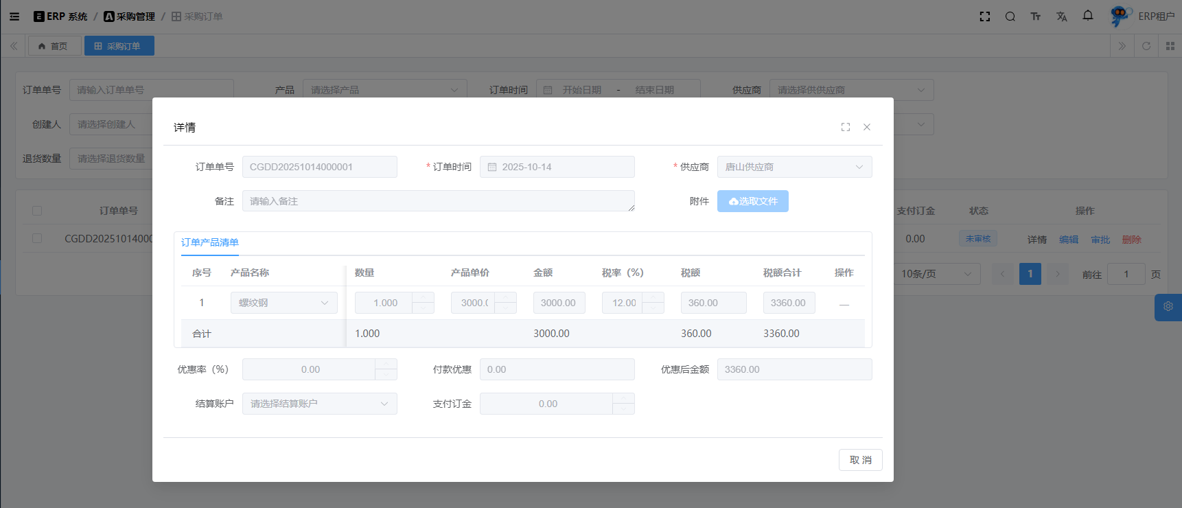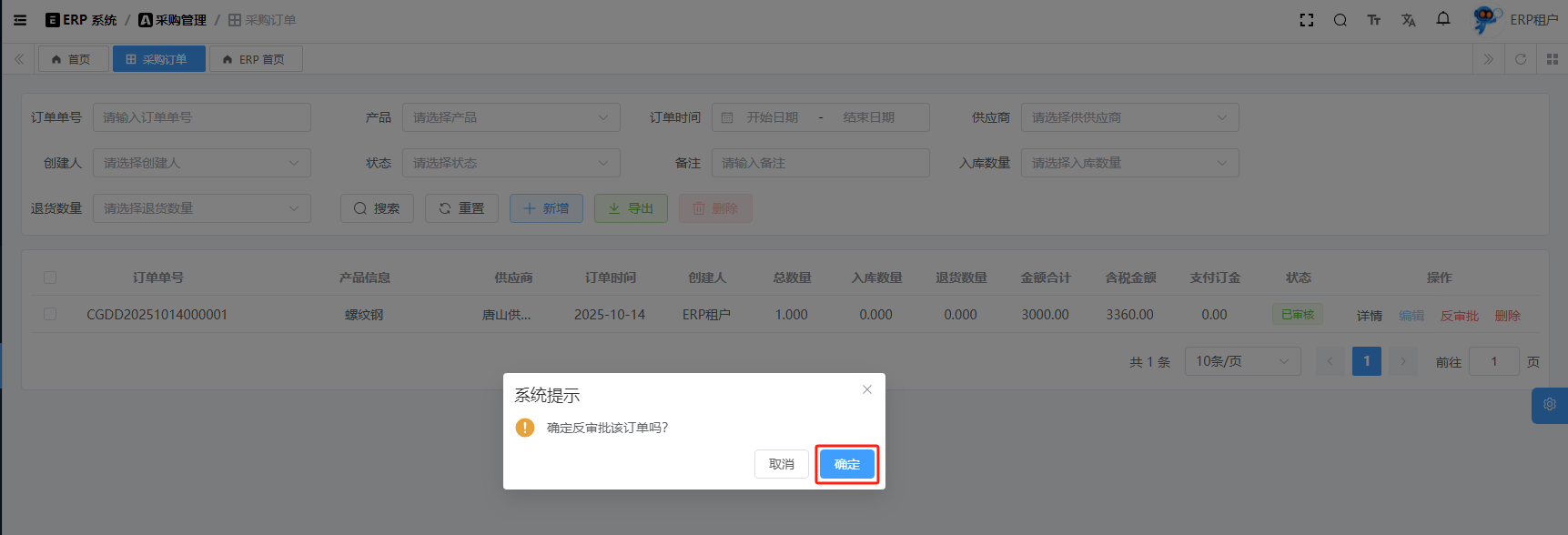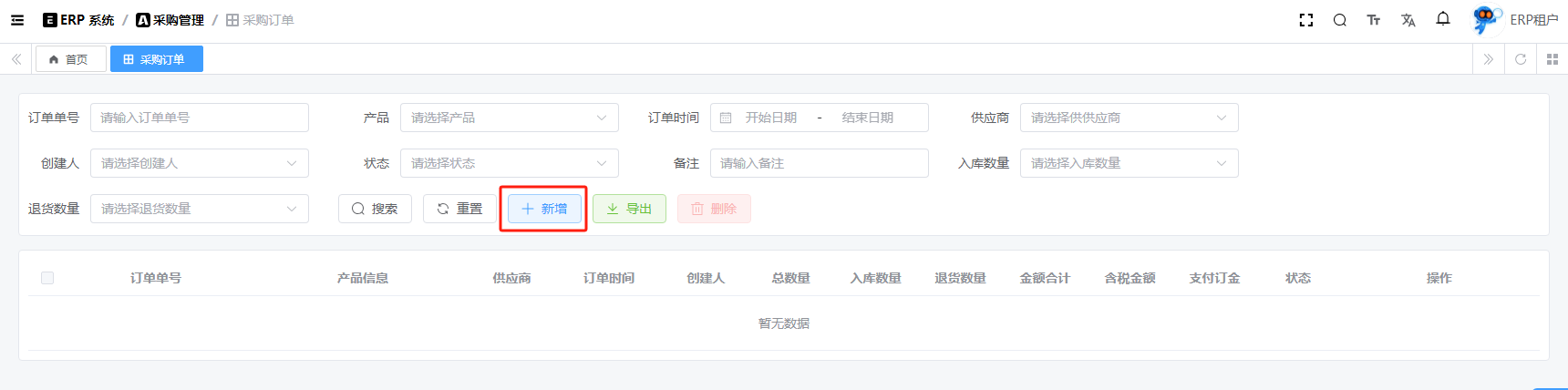 目录 搜索 展开 系统设置用户管理角色管理部门管理岗位管理消息中心短信管理短信日志邮箱管理邮件记录站内信管理消息记录通知公告工作流程流程管理流程模型流程分类审批中心我的流程待办任务已办任务抄送我的CRM系统待办事项线索管理客户管理联系人管理客户公海商机管理合同管理回款管理回款计划产品管理数据统计客户分析排行榜员工业绩客户画像销售漏斗系统配置客户公海配置客户限制配置产品分类配置商机状态配置合同配置ERP系统采购管理采购订单采购入库采购退货供应商信息销售管理销售订单销售出库销售退货客户信息库存管理仓库信息产品库存出入库明细其它入库其它出库库存调拨库存盘点产品管理产品信息产品分类产品单位财务管理付款单收款单结算账户 暂无相关搜索结果! 阅读次数:15 采购订单 采购订单,它不会直接影响库存,只有在入库、退货等操作才会影响库存。1.1新增1.2编辑1.3删除1.4详情1.5审批1.6反审批作者:admin 创建时间:2025-10-13 11:31最后编辑:admin 更新时间:2025-10-14 11:08