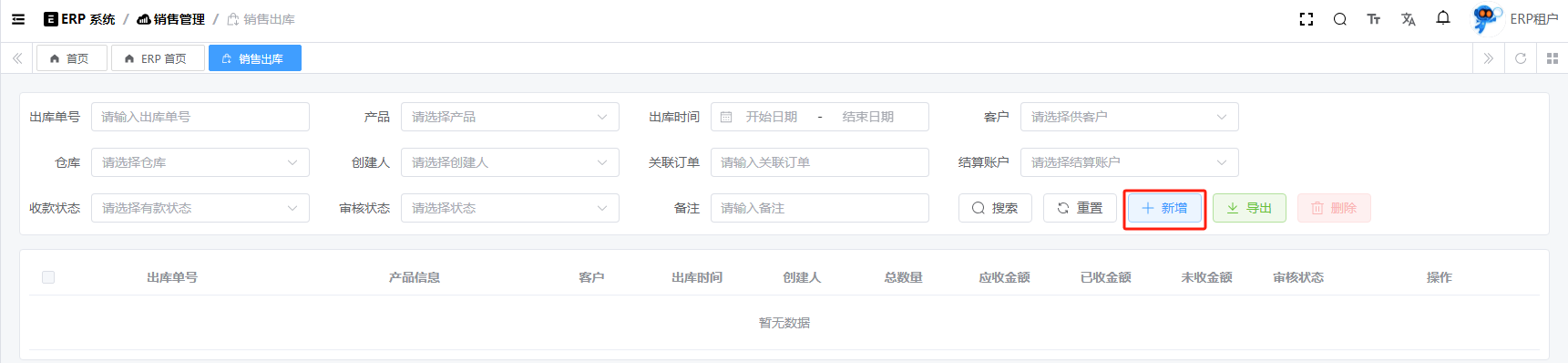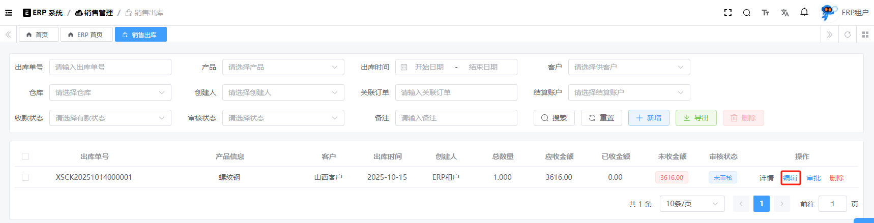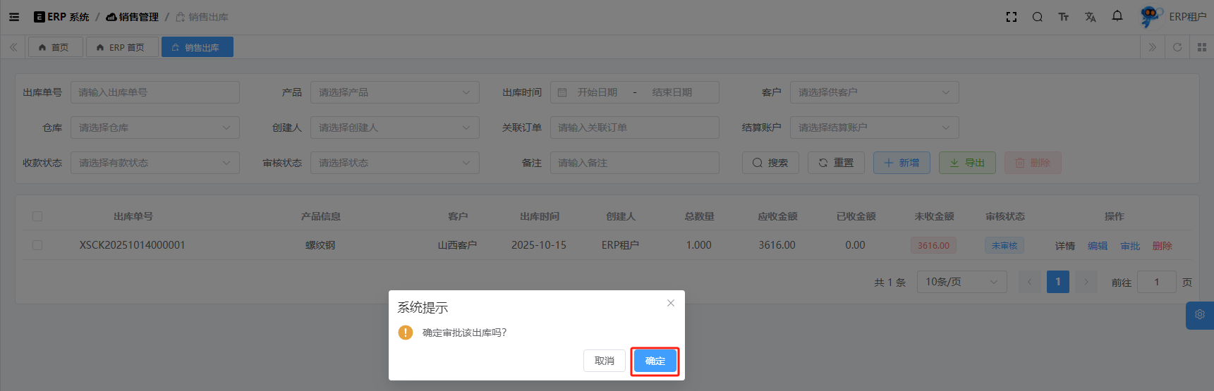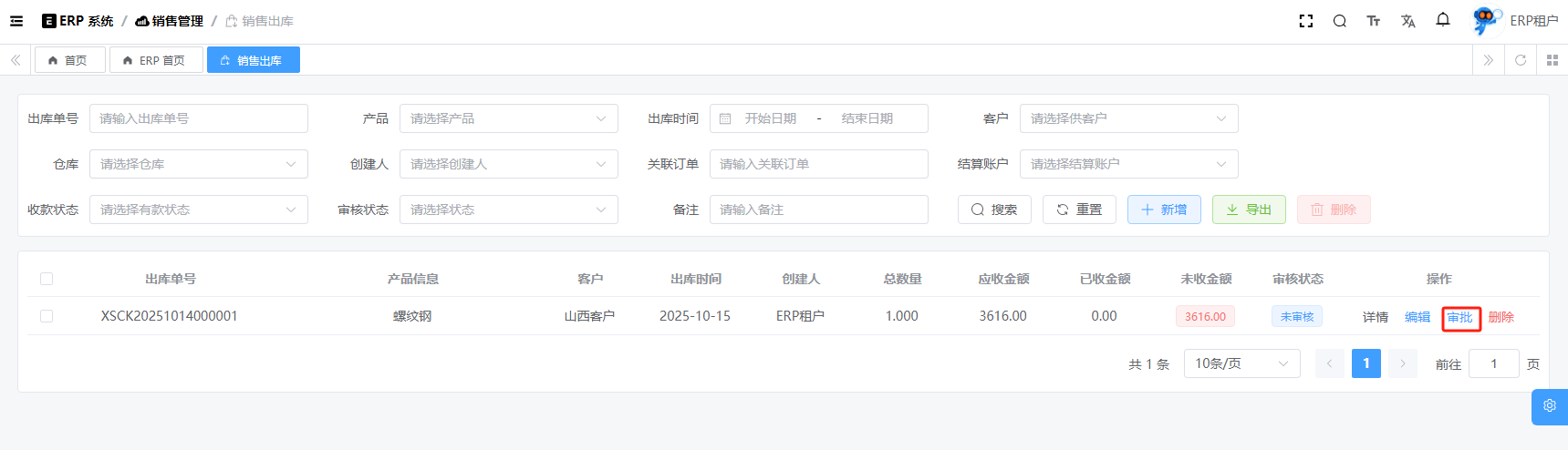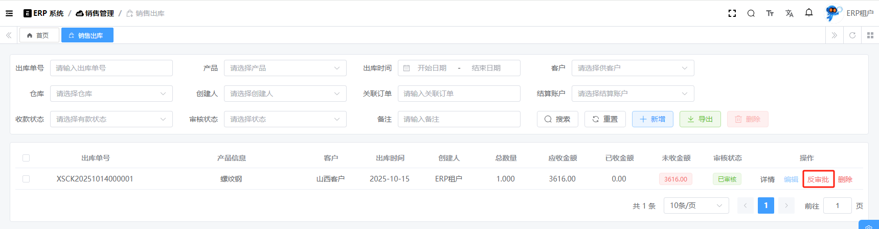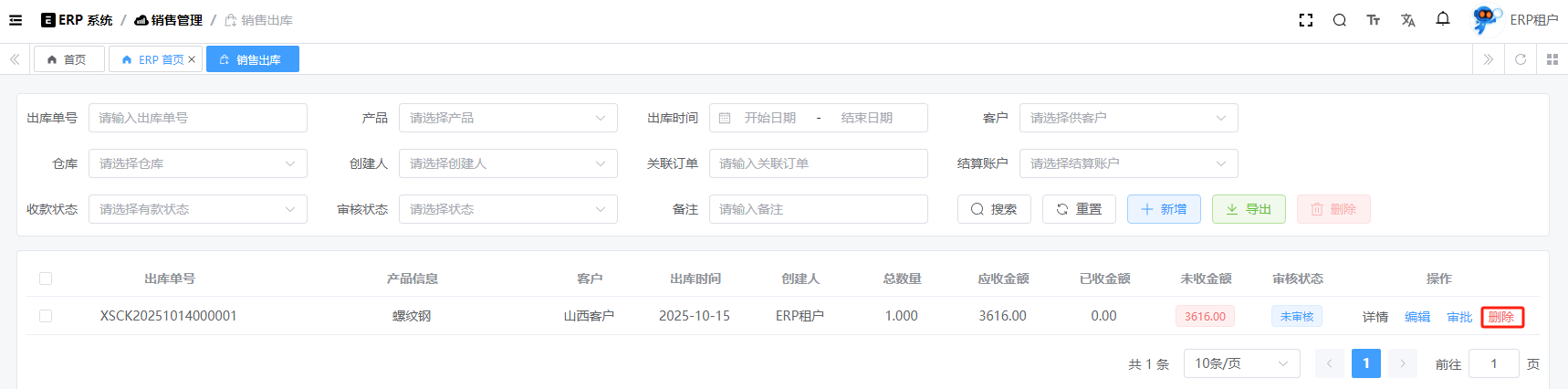 目录 搜索 展开 系统设置用户管理角色管理部门管理岗位管理消息中心短信管理短信日志邮箱管理邮件记录站内信管理消息记录通知公告工作流程流程管理流程模型流程分类审批中心我的流程待办任务已办任务抄送我的CRM系统待办事项线索管理客户管理联系人管理客户公海商机管理合同管理回款管理回款计划产品管理数据统计客户分析排行榜员工业绩客户画像销售漏斗系统配置客户公海配置客户限制配置产品分类配置商机状态配置合同配置ERP系统采购管理采购订单采购入库采购退货供应商信息销售管理销售订单销售出库销售退货客户信息库存管理仓库信息产品库存出入库明细其它入库其它出库库存调拨库存盘点产品管理产品信息产品分类产品单位财务管理付款单收款单结算账户 暂无相关搜索结果! 阅读次数:15 销售出库 销售出库,它会影响(减少)库存。总的来说,它的逻辑和 其它出库 基本一致,只是它是针对销售的出库。1.1新增1.2编辑1.3删除1.4详情1.5审批1.6反审批作者:admin 创建时间:2025-10-13 11:33最后编辑:admin 更新时间:2025-10-14 11:08