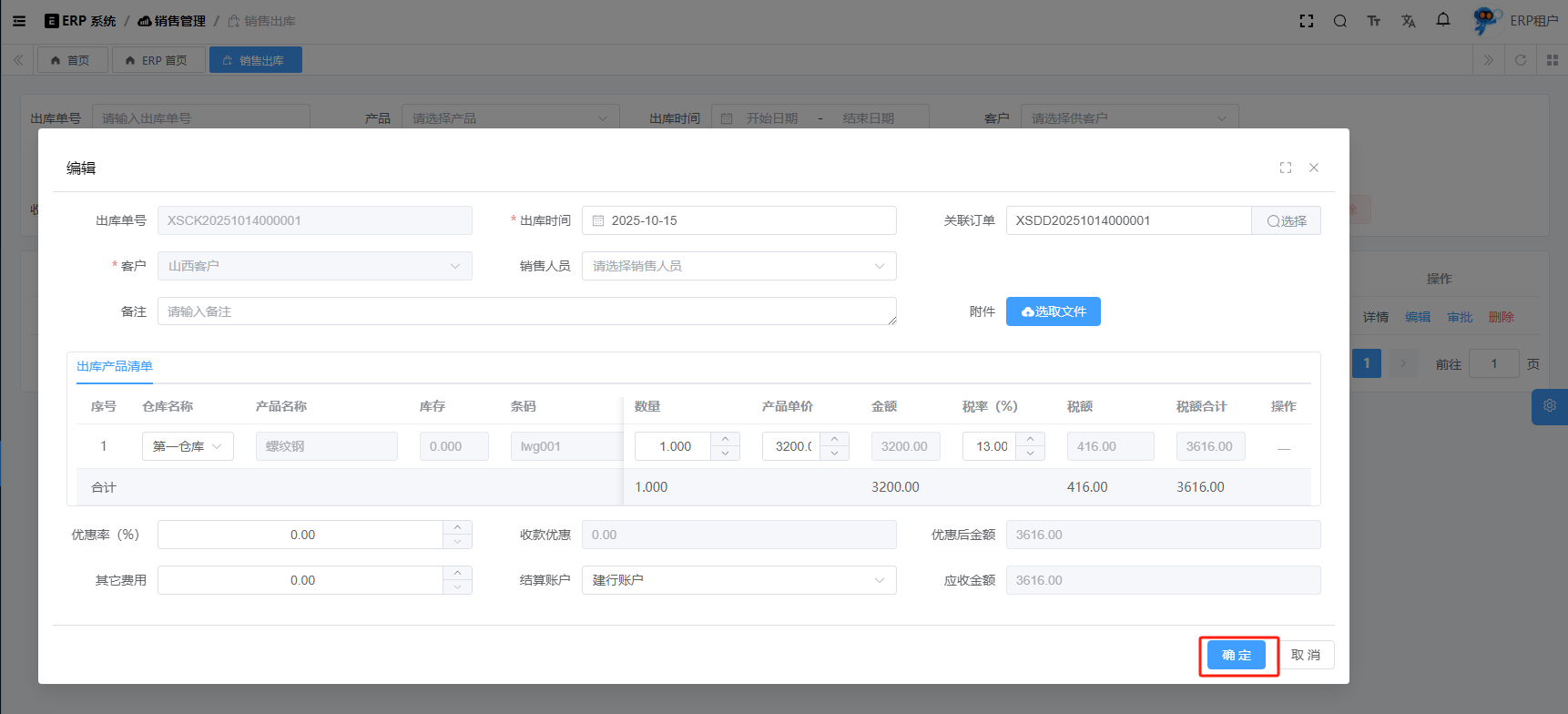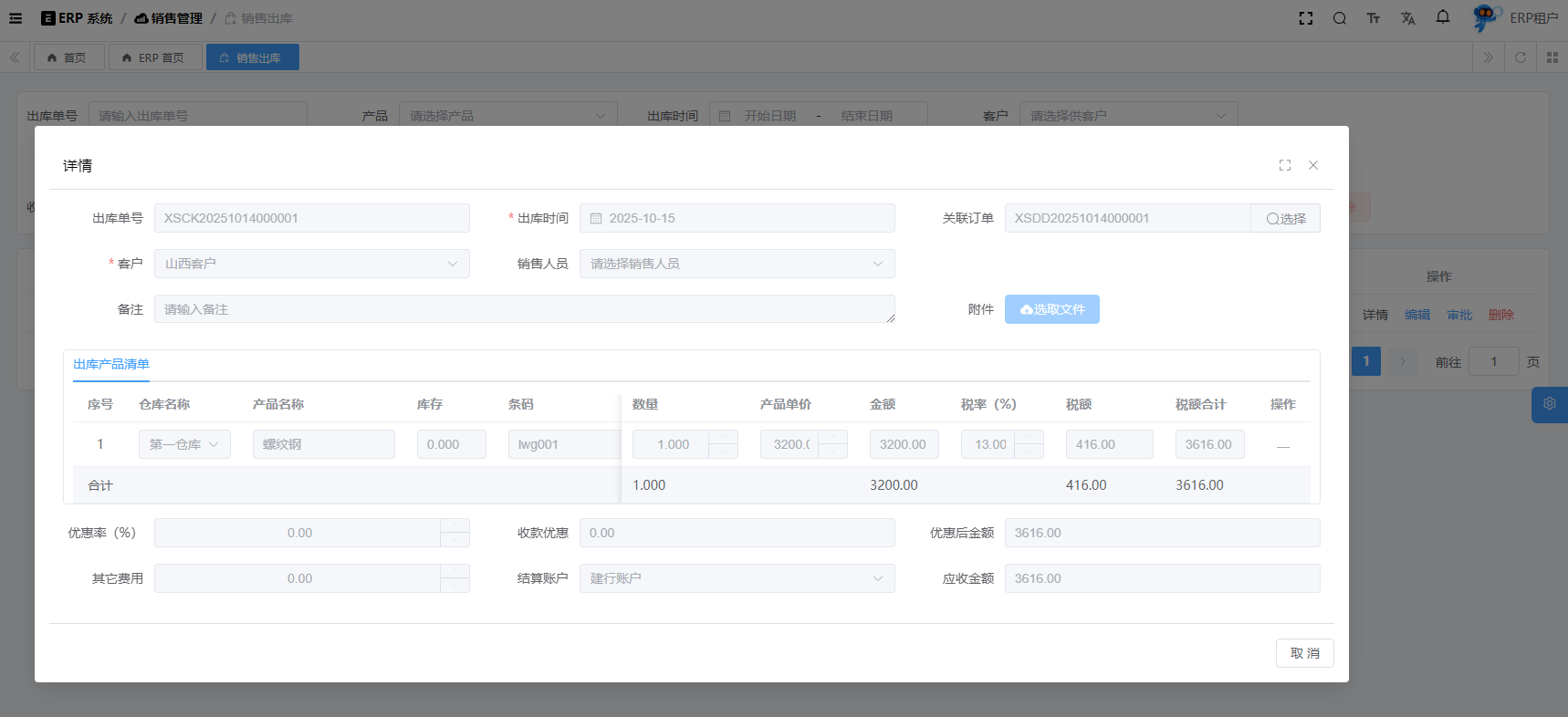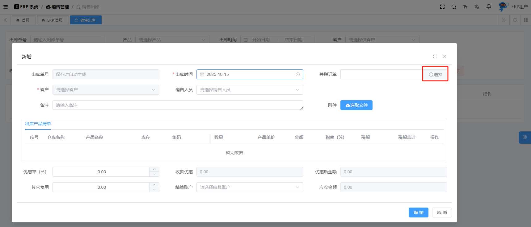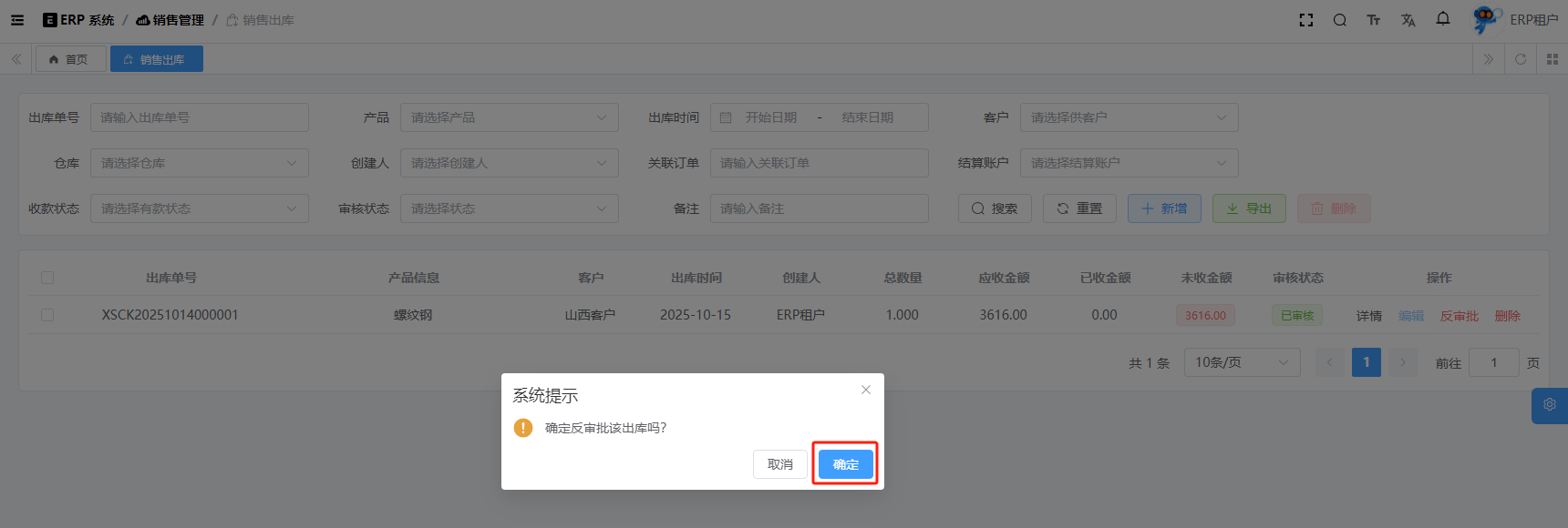 目录 搜索 展开 系统设置用户管理角色管理部门管理岗位管理消息中心短信管理短信日志邮箱管理邮件记录站内信管理消息记录通知公告工作流程流程管理流程模型流程分类审批中心我的流程待办任务已办任务抄送我的CRM系统待办事项线索管理客户管理联系人管理客户公海商机管理合同管理回款管理回款计划产品管理数据统计客户分析排行榜员工业绩客户画像销售漏斗系统配置客户公海配置客户限制配置产品分类配置商机状态配置合同配置ERP系统采购管理采购订单采购入库采购退货供应商信息销售管理销售订单销售出库销售退货客户信息库存管理仓库信息产品库存出入库明细其它入库其它出库库存调拨库存盘点产品管理产品信息产品分类产品单位财务管理付款单收款单结算账户 暂无相关搜索结果! 阅读次数:15 销售出库 销售出库,它会影响(减少)库存。总的来说,它的逻辑和 其它出库 基本一致,只是它是针对销售的出库。1.1新增1.2编辑1.3删除1.4详情1.5审批1.6反审批作者:admin 创建时间:2025-10-13 11:33最后编辑:admin 更新时间:2025-10-14 11:08