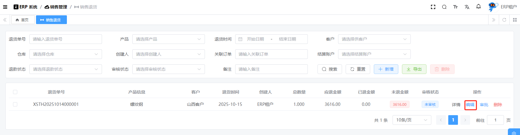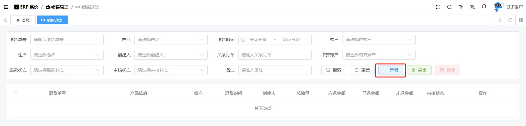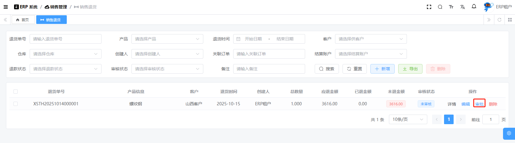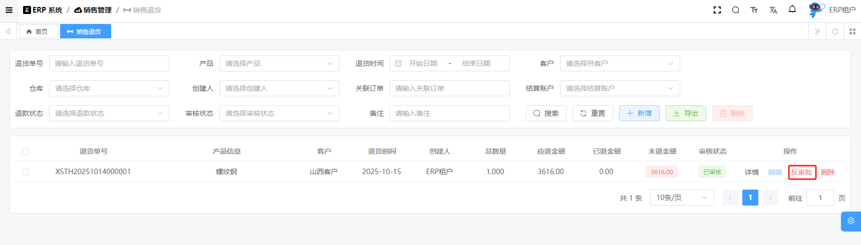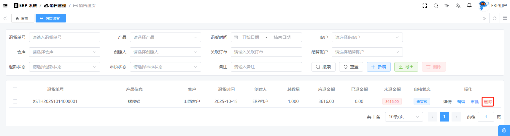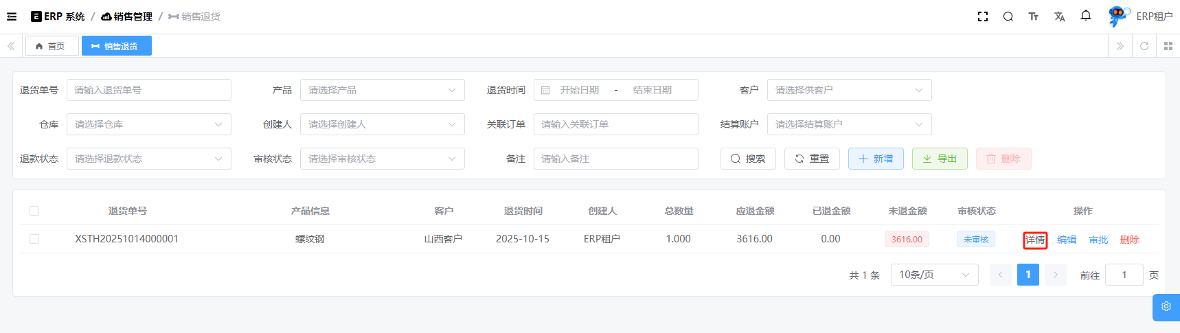 目录 搜索 展开 系统设置用户管理角色管理部门管理岗位管理消息中心短信管理短信日志邮箱管理邮件记录站内信管理消息记录通知公告工作流程流程管理流程模型流程分类审批中心我的流程待办任务已办任务抄送我的CRM系统待办事项线索管理客户管理联系人管理客户公海商机管理合同管理回款管理回款计划产品管理数据统计客户分析排行榜员工业绩客户画像销售漏斗系统配置客户公海配置客户限制配置产品分类配置商机状态配置合同配置ERP系统采购管理采购订单采购入库采购退货供应商信息销售管理销售订单销售出库销售退货客户信息库存管理仓库信息产品库存出入库明细其它入库其它出库库存调拨库存盘点产品管理产品信息产品分类产品单位财务管理付款单收款单结算账户 暂无相关搜索结果! 阅读次数:15 销售退货 销售退货,它会影响(增加)库存。总的来说,它的逻辑和 其它入库 基本一致,只是它是针对销售的入库。1.1新增1.2编辑1.3删除1.4详情1.5审批1.6反审批作者:admin 创建时间:2025-10-13 11:33最后编辑:admin 更新时间:2025-10-14 11:08