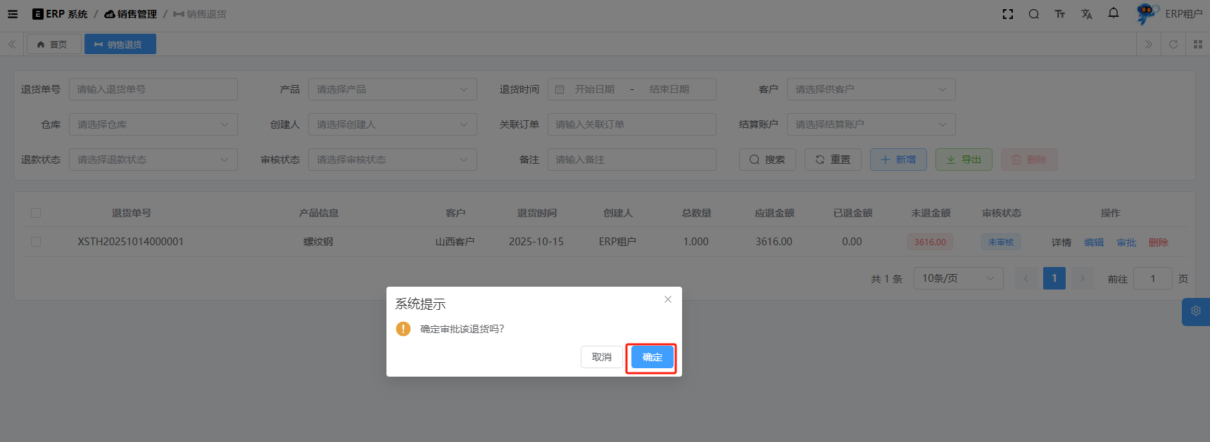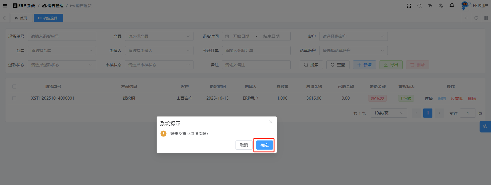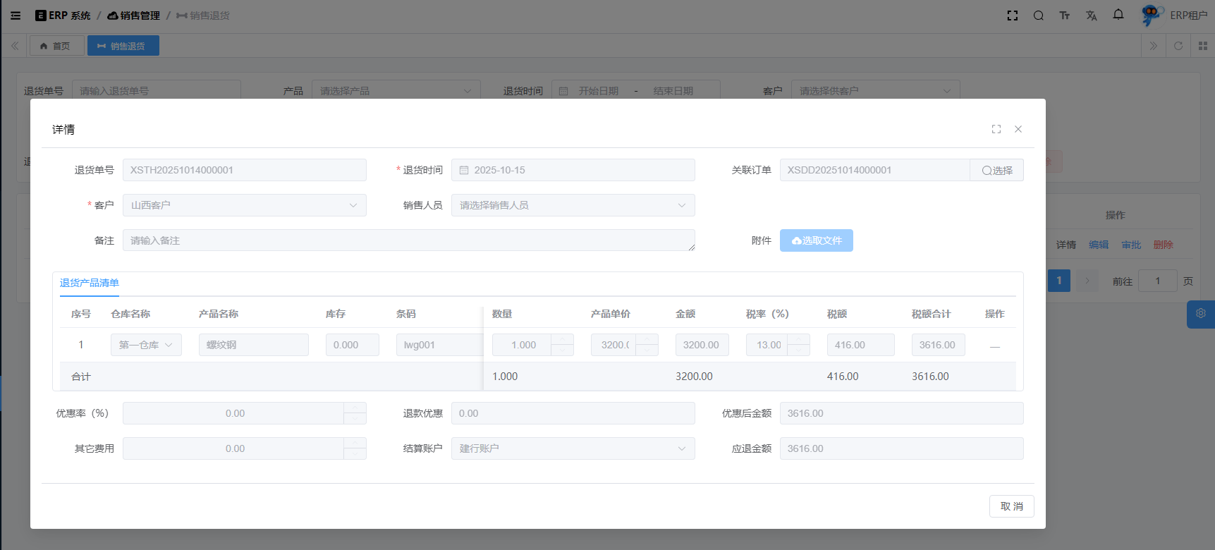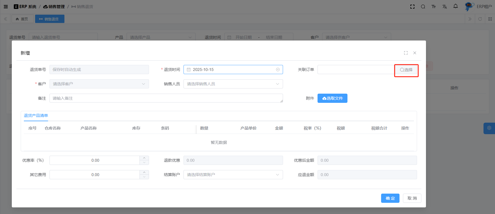 目录 搜索 展开 系统设置用户管理角色管理部门管理岗位管理消息中心短信管理短信日志邮箱管理邮件记录站内信管理消息记录通知公告工作流程流程管理流程模型流程分类审批中心我的流程待办任务已办任务抄送我的CRM系统待办事项线索管理客户管理联系人管理客户公海商机管理合同管理回款管理回款计划产品管理数据统计客户分析排行榜员工业绩客户画像销售漏斗系统配置客户公海配置客户限制配置产品分类配置商机状态配置合同配置ERP系统采购管理采购订单采购入库采购退货供应商信息销售管理销售订单销售出库销售退货客户信息库存管理仓库信息产品库存出入库明细其它入库其它出库库存调拨库存盘点产品管理产品信息产品分类产品单位财务管理付款单收款单结算账户 暂无相关搜索结果! 阅读次数:15 销售退货 销售退货,它会影响(增加)库存。总的来说,它的逻辑和 其它入库 基本一致,只是它是针对销售的入库。1.1新增1.2编辑1.3删除1.4详情1.5审批1.6反审批作者:admin 创建时间:2025-10-13 11:33最后编辑:admin 更新时间:2025-10-14 11:08