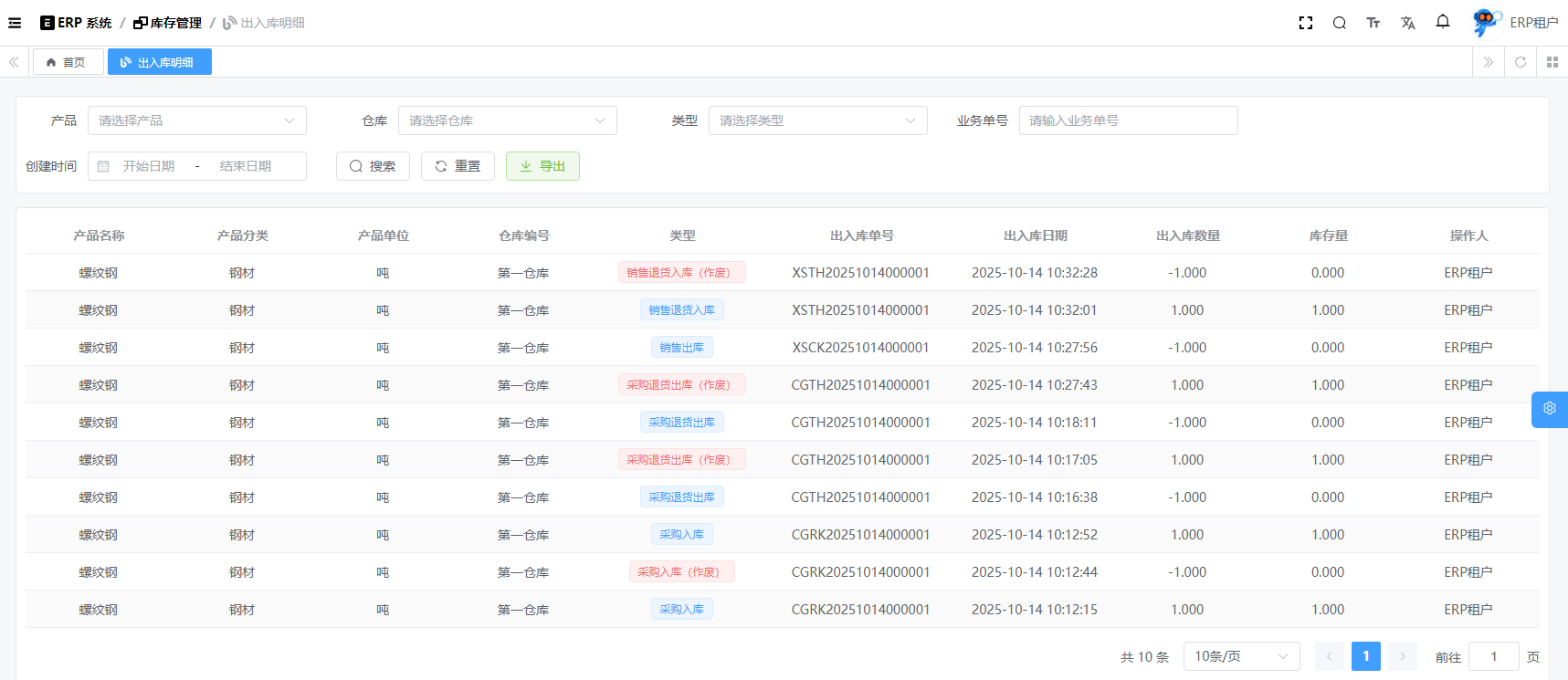 目录 搜索 展开 系统设置用户管理角色管理部门管理岗位管理消息中心短信管理短信日志邮箱管理邮件记录站内信管理消息记录通知公告工作流程流程管理流程模型流程分类审批中心我的流程待办任务已办任务抄送我的CRM系统待办事项线索管理客户管理联系人管理客户公海商机管理合同管理回款管理回款计划产品管理数据统计客户分析排行榜员工业绩客户画像销售漏斗系统配置客户公海配置客户限制配置产品分类配置商机状态配置合同配置ERP系统采购管理采购订单采购入库采购退货供应商信息销售管理销售订单销售出库销售退货客户信息库存管理仓库信息产品库存出入库明细其它入库其它出库库存调拨库存盘点产品管理产品信息产品分类产品单位财务管理付款单收款单结算账户 暂无相关搜索结果! 阅读次数:13 出入库明细 出入库明细列表作者:admin 创建时间:2025-10-13 11:34最后编辑:admin 更新时间:2025-10-14 11:08