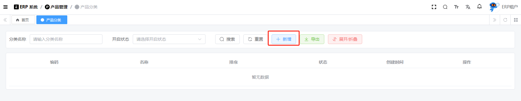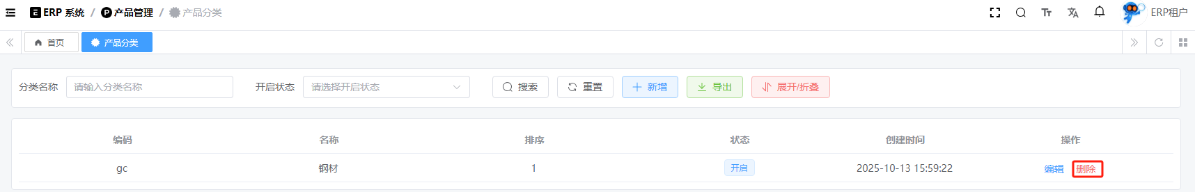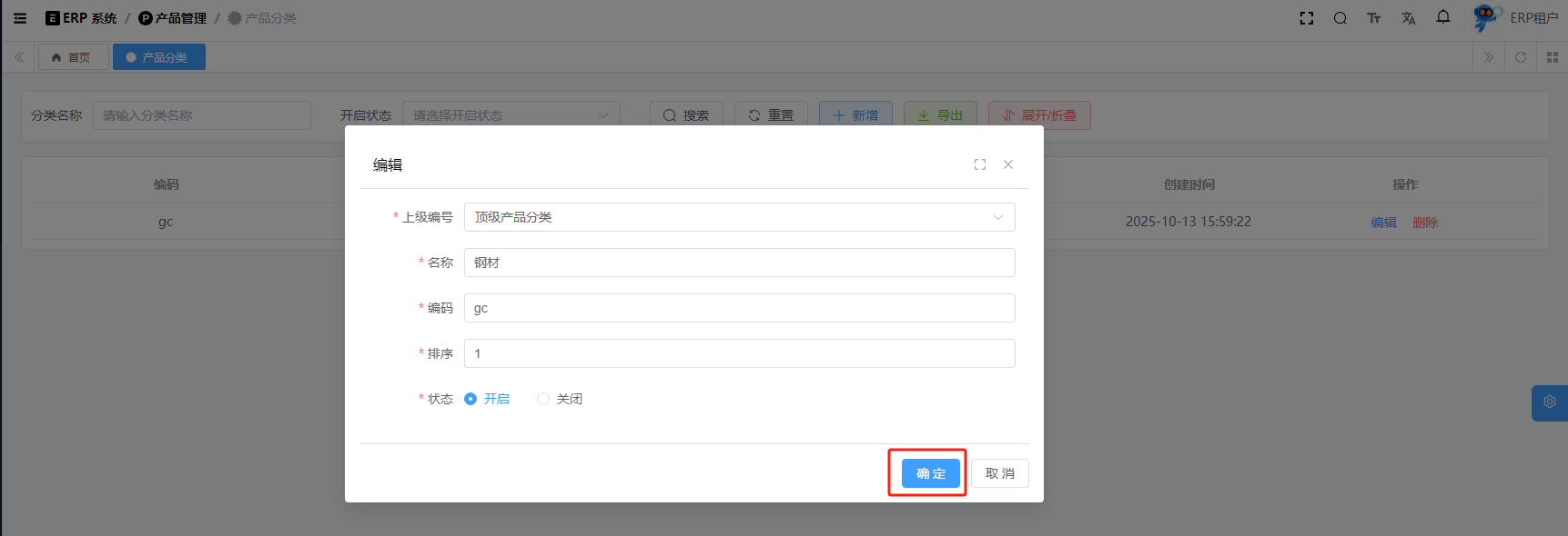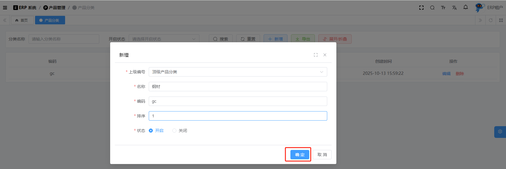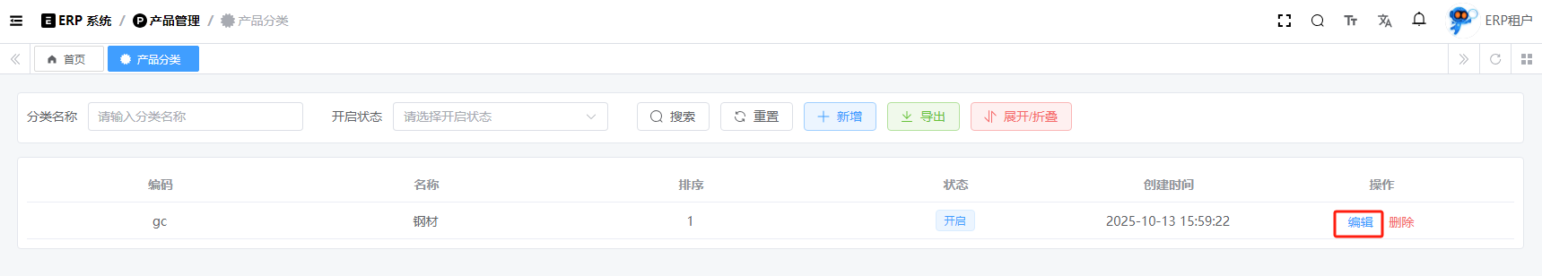 目录 搜索 展开 系统设置用户管理角色管理部门管理岗位管理消息中心短信管理短信日志邮箱管理邮件记录站内信管理消息记录通知公告工作流程流程管理流程模型流程分类审批中心我的流程待办任务已办任务抄送我的CRM系统待办事项线索管理客户管理联系人管理客户公海商机管理合同管理回款管理回款计划产品管理数据统计客户分析排行榜员工业绩客户画像销售漏斗系统配置客户公海配置客户限制配置产品分类配置商机状态配置合同配置ERP系统采购管理采购订单采购入库采购退货供应商信息销售管理销售订单销售出库销售退货客户信息库存管理仓库信息产品库存出入库明细其它入库其它出库库存调拨库存盘点产品管理产品信息产品分类产品单位财务管理付款单收款单结算账户 暂无相关搜索结果! 阅读次数:12 产品分类 1.1新增1.2编辑1.3删除作者:admin 创建时间:2025-10-13 11:36最后编辑:admin 更新时间:2025-10-14 11:08